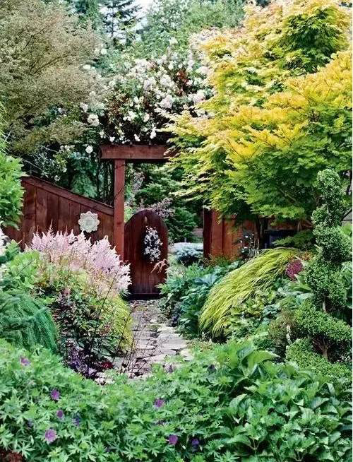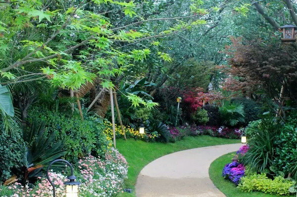 和谐的色彩搭配,又可使得花园在变化中呈现较为和谐的景色,制造出高低错落的迷人景致却又避免过于杂乱的景象。自然式的植物配置则极为丰富,利用植物不同的树姿、以达到四季有景的效果