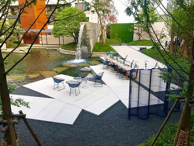 铺装园路中采用汀步,用硬度高,耐腐蚀的花岗岩材质,这显得更有细腻感,更能表达出庭院主题,也会使用一些文字、图形、特殊符号传达空间主题,加深意境。