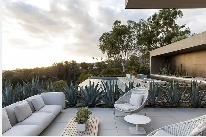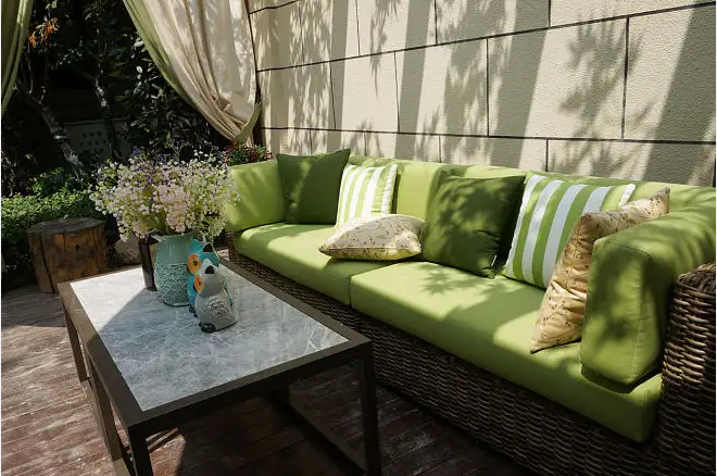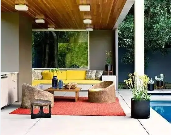 庭院软装是长期放置在户外的,可优先选择耐腐蚀的易打理的户外沙发,可以为沙发设计防雨罩,也可以装一个大型的遮阳伞,要将其加固防风避免遮阳伞在大风天气被刮坏。