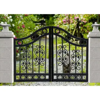 花园门也需要注重色彩的搭配,随着围墙颜色以及环境调整颜色样式。花园门的颜色相对于围墙颜色要更加突出,比如采用对比色,围墙是浅色,花园门选择古铜色的花园门。
