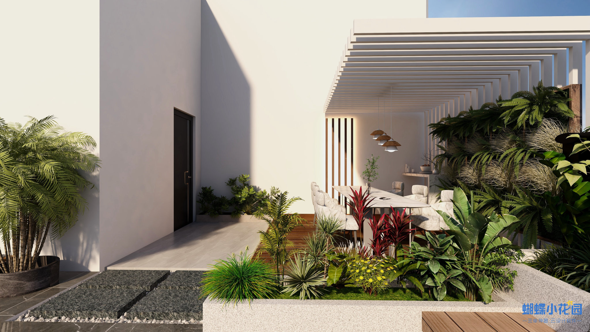 植物配置以简洁的绿植为主,如造型独特的仙人掌、龟背竹等热带植物,或修剪整齐的绿篱,强调植物的形态与质感,通过少量而精致的植物搭配,展现出简洁而富有生命力的景观效果。