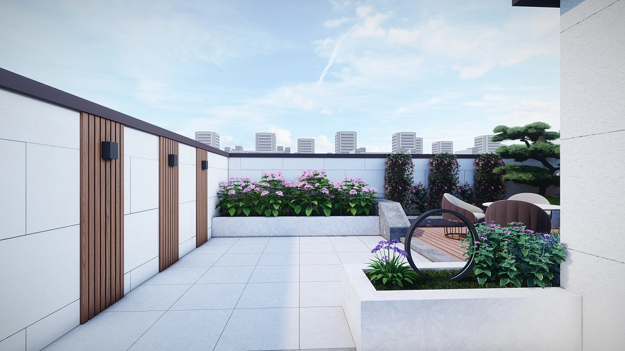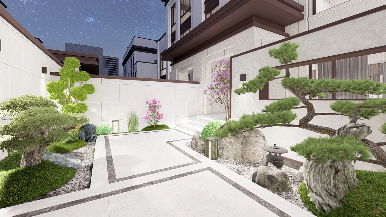 选用白色地板,铺成有规则的石板路,独有美感。在庭院中漫步,情调悠然,宛如一副风景画。