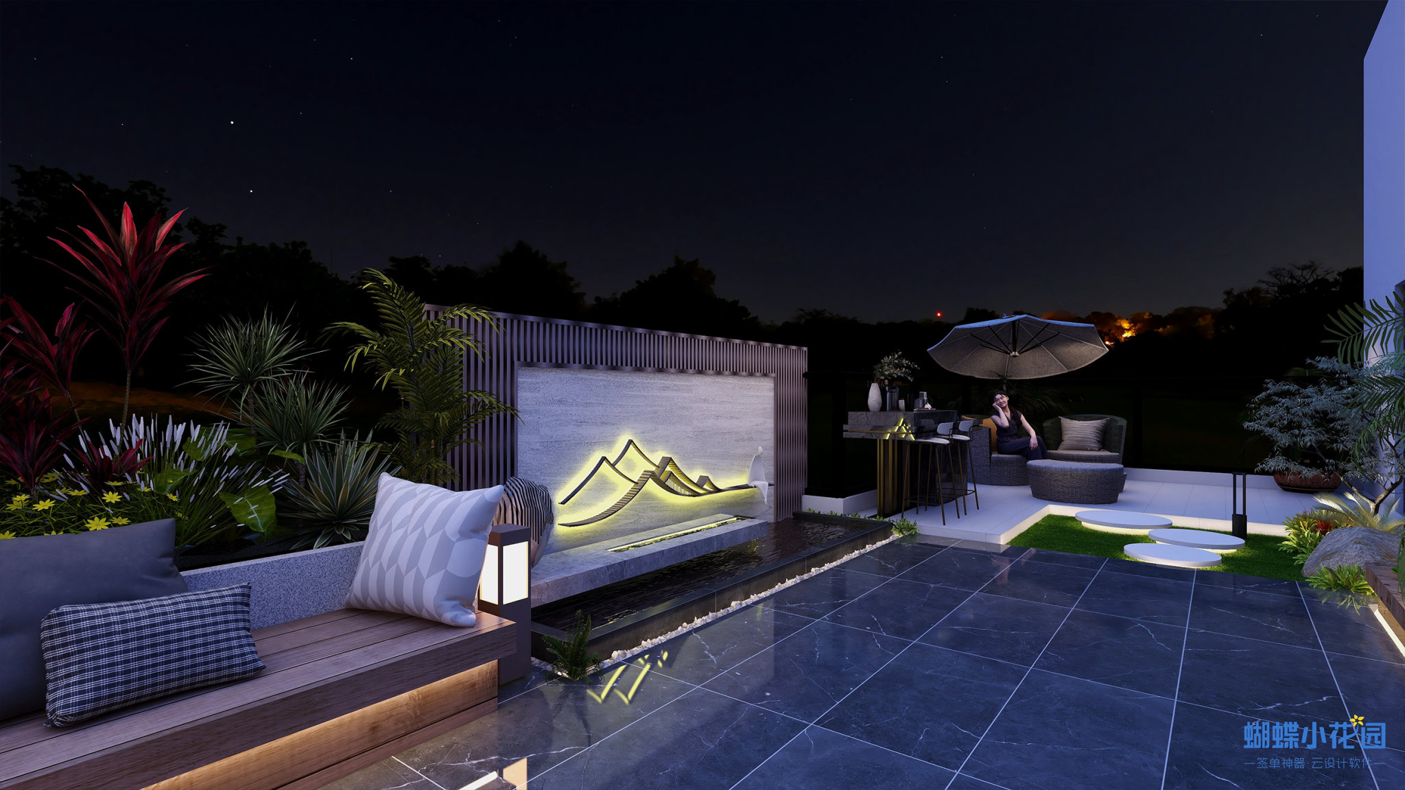 可以为庭院创造出不同的氛围和效果。可以使用太阳能灯具或低功率LED灯,照亮庭院的重要区域,如花坛、树木和景观装饰物。